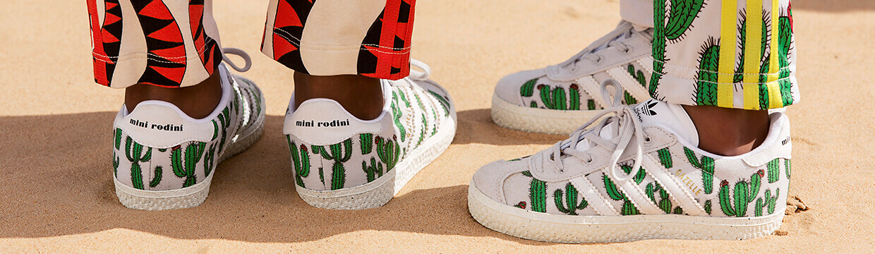 Этим летом adidas Originals by Mini Rodini предлагают два новых принта, созданных Кассандрой Родин. Первый – яркий узор с красными змеями, который украшает оригинальные модели. Второй – рисунок из кактусов, который нанесен на кроссовки Gazelle.